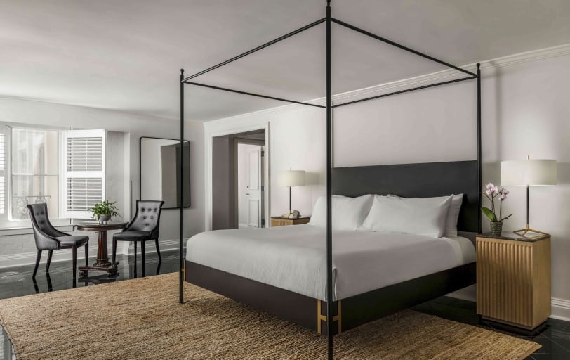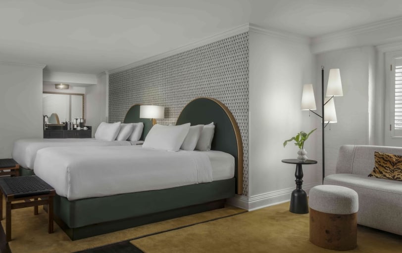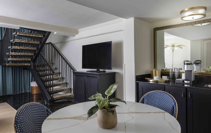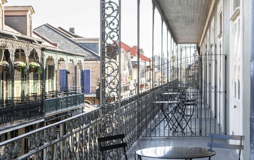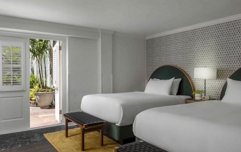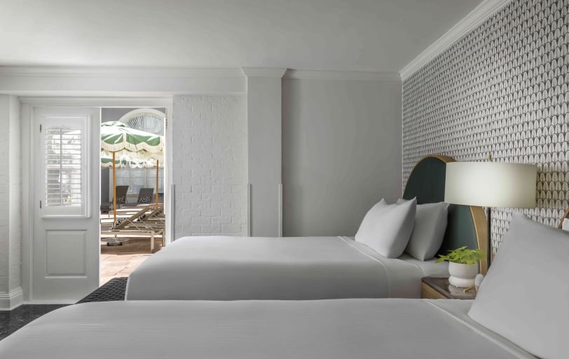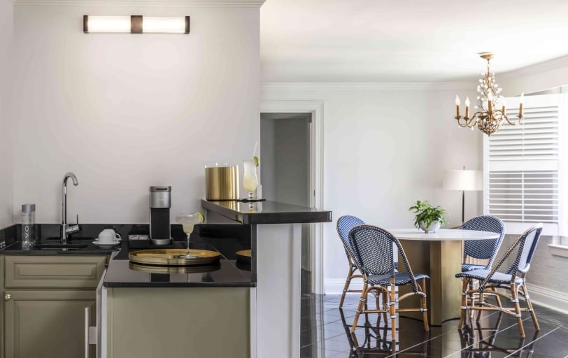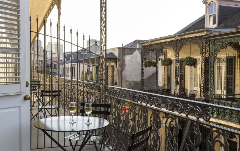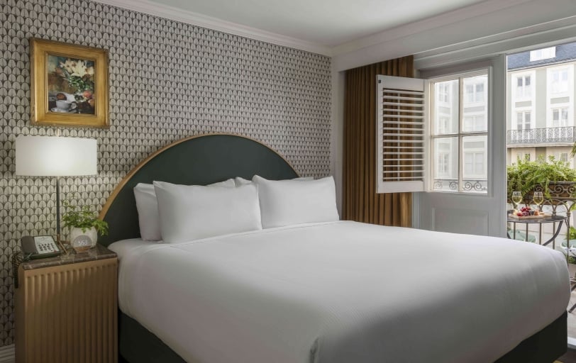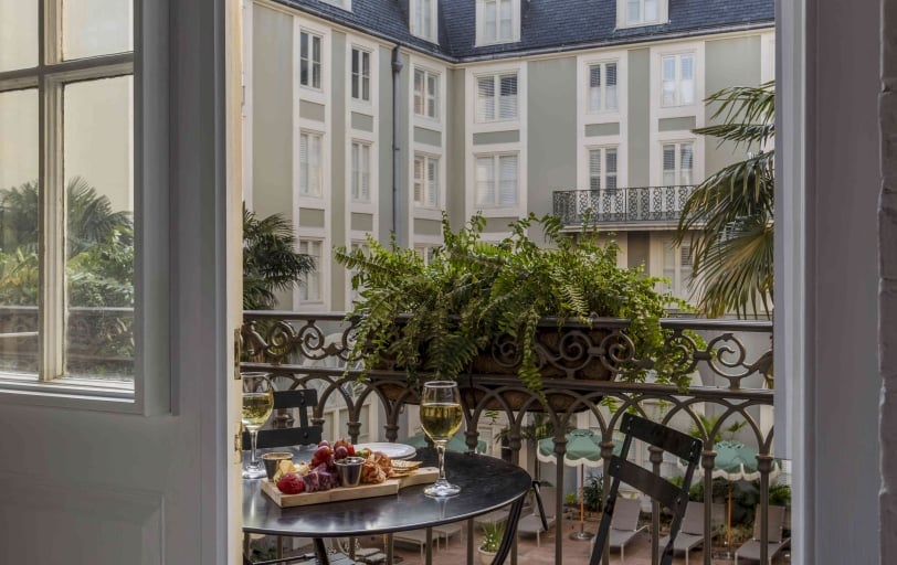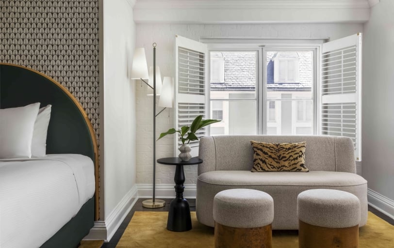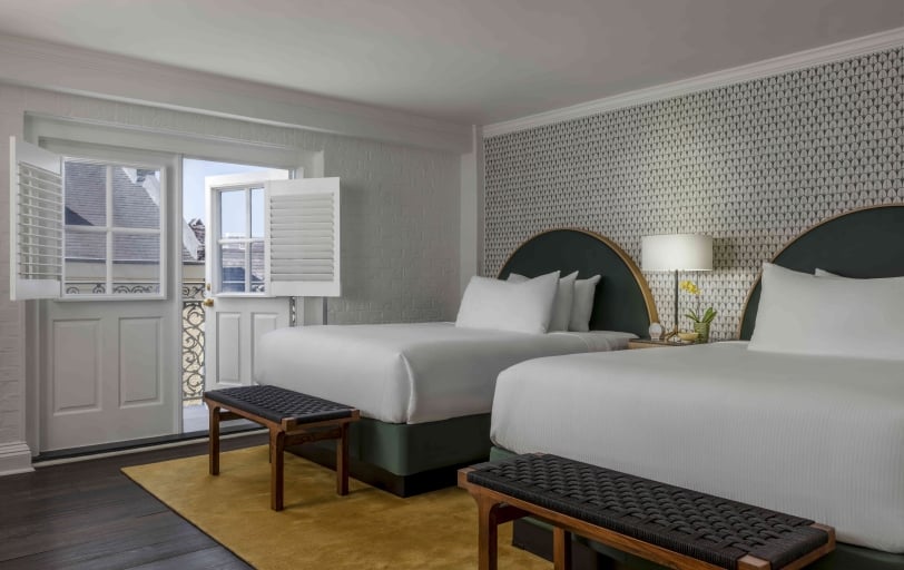 Enjoy your own sitting area styled in our modern French-country décor, a sleek kitchenette, custom wide-blade shutters, double queen beds, top floor views of the French Quarter and beautiful black marble bathrooms.