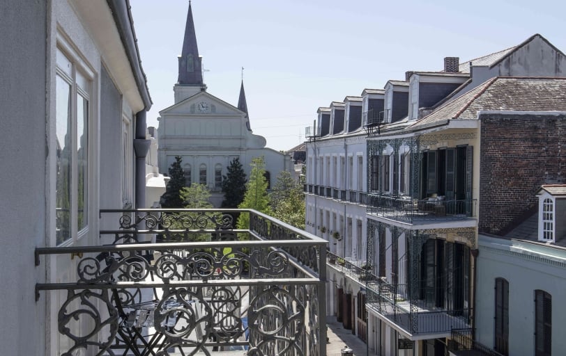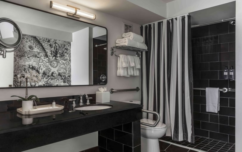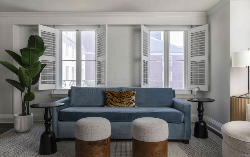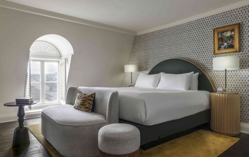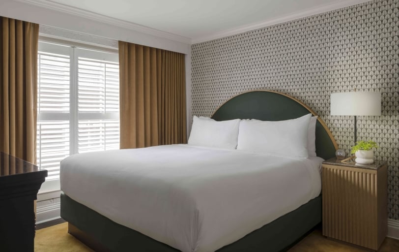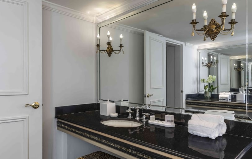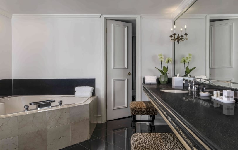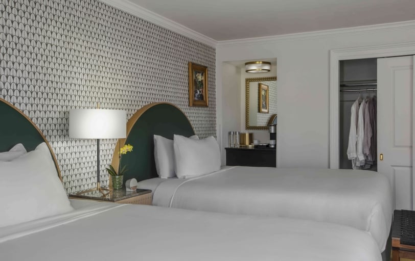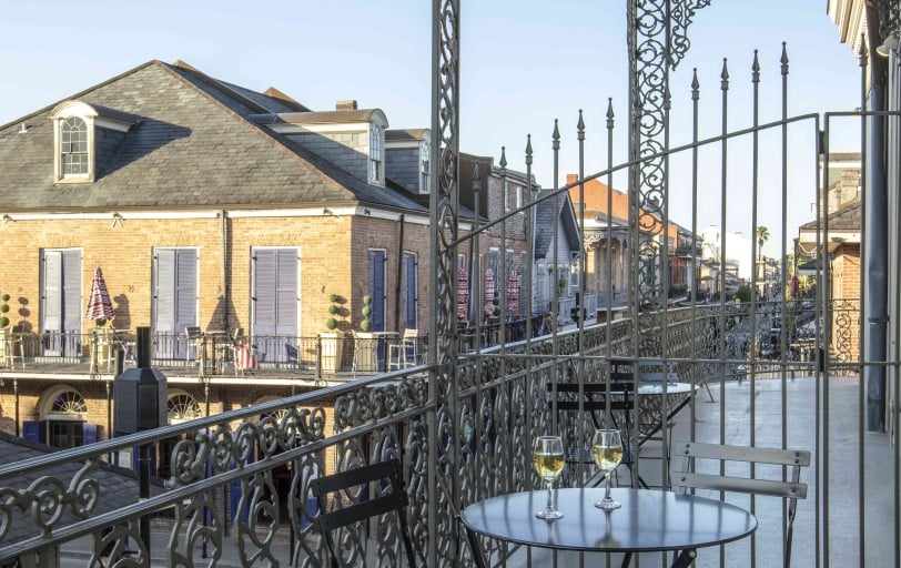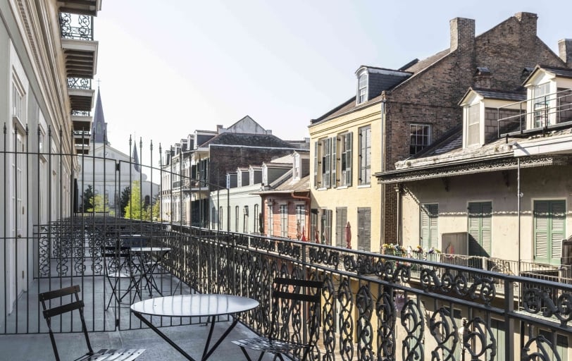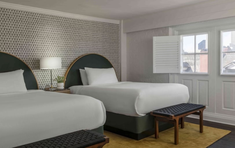 Enjoy your own sitting area styled in our modern French-country décor, a sleek kitchenette, custom wide-blade shutters, double queen beds, top floor views of the French Quarter and beautiful black marble bathrooms.