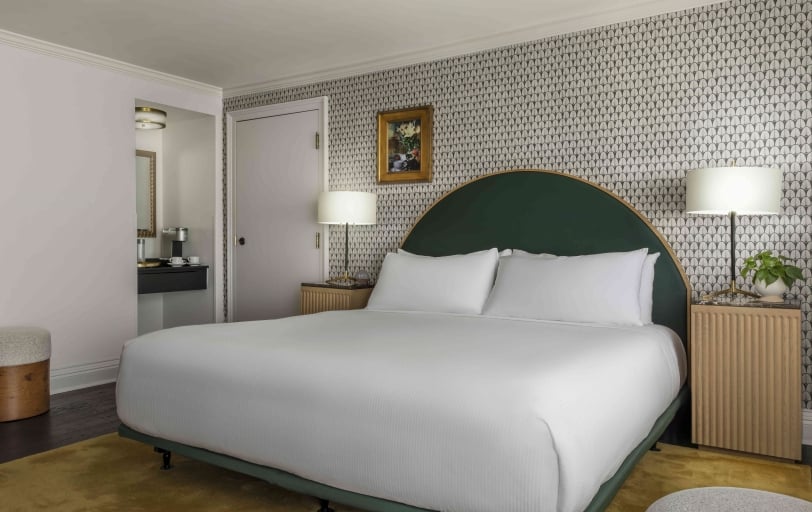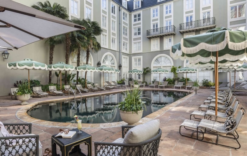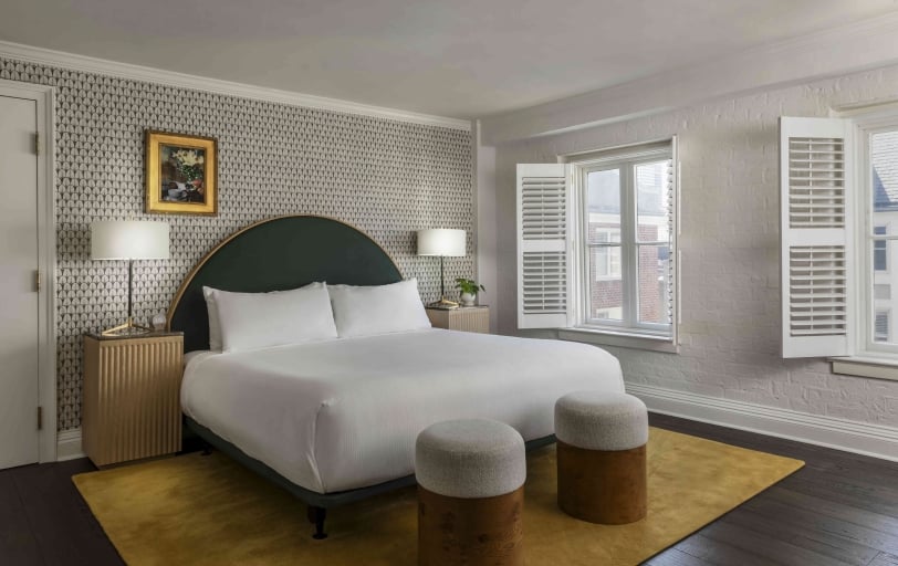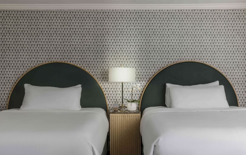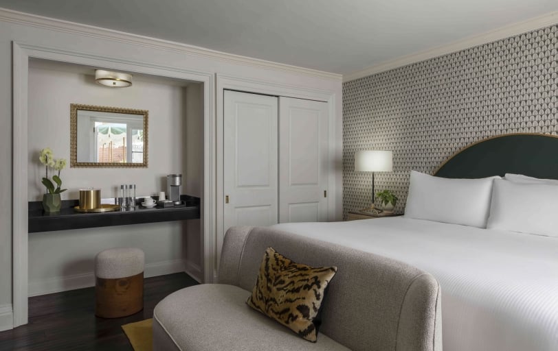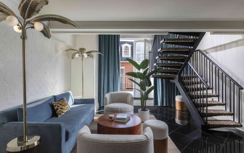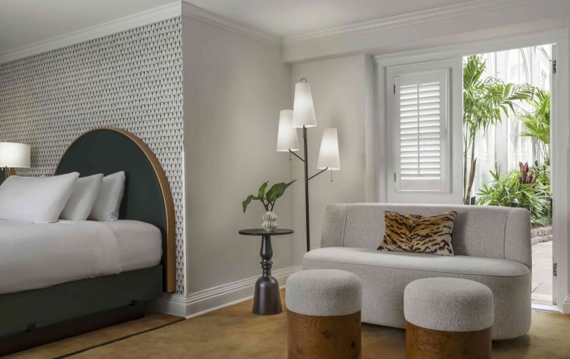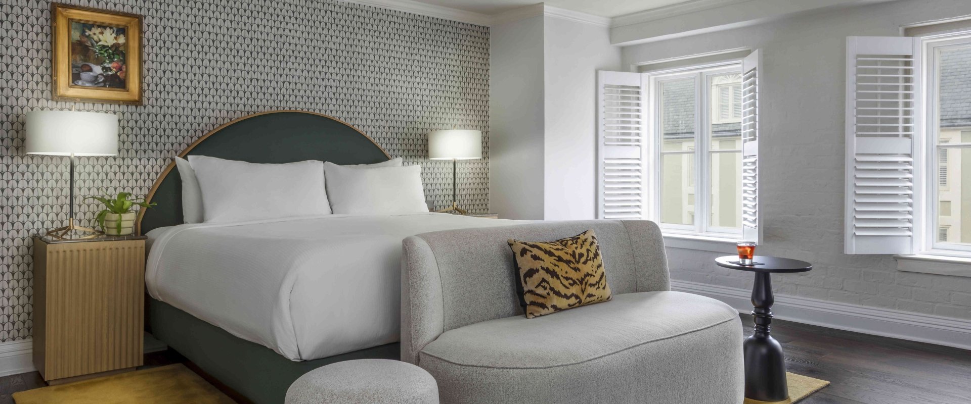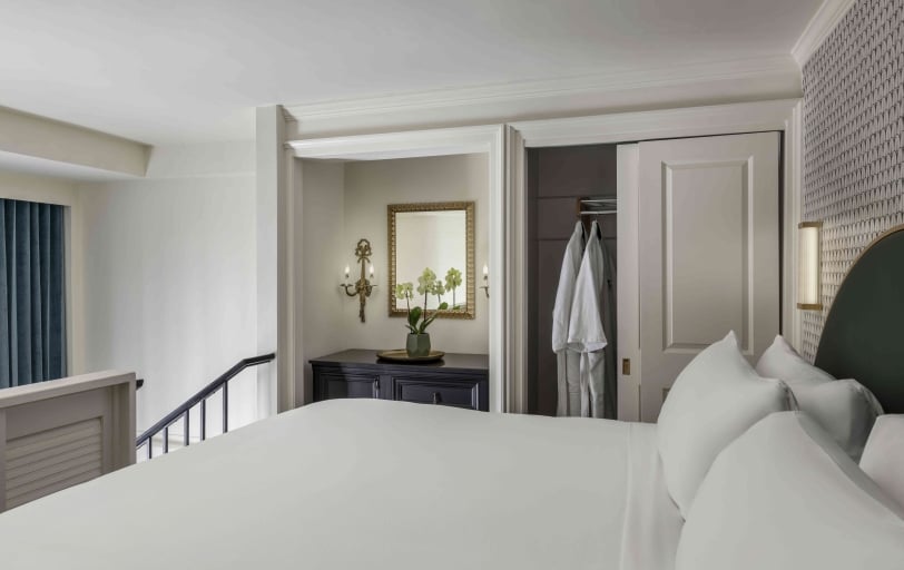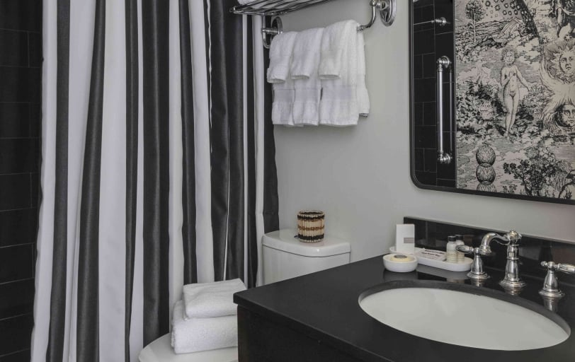 Enjoy your own sitting area styled in our modern French-country décor, a sleek kitchenette, custom wide-blade shutters, double queen beds, top floor views of the French Quarter and beautiful black marble bathrooms.