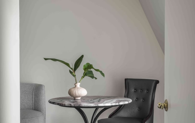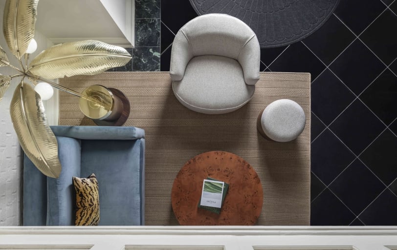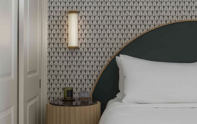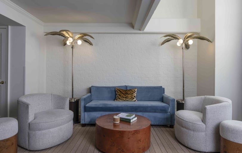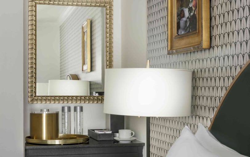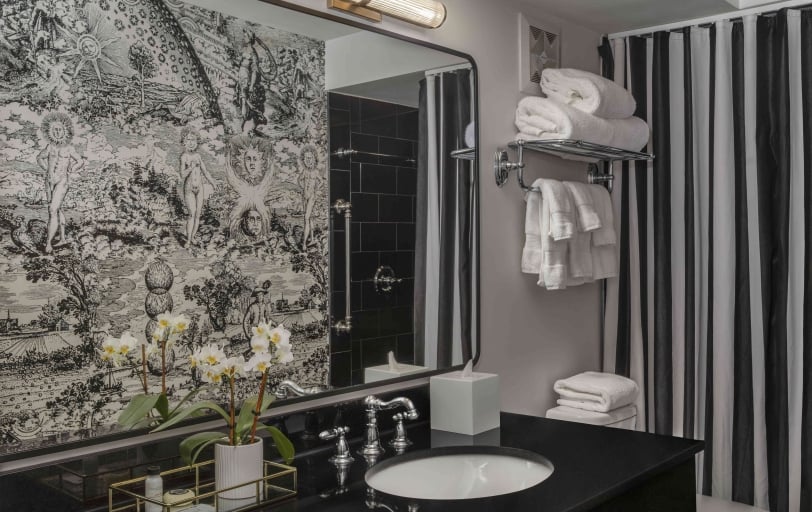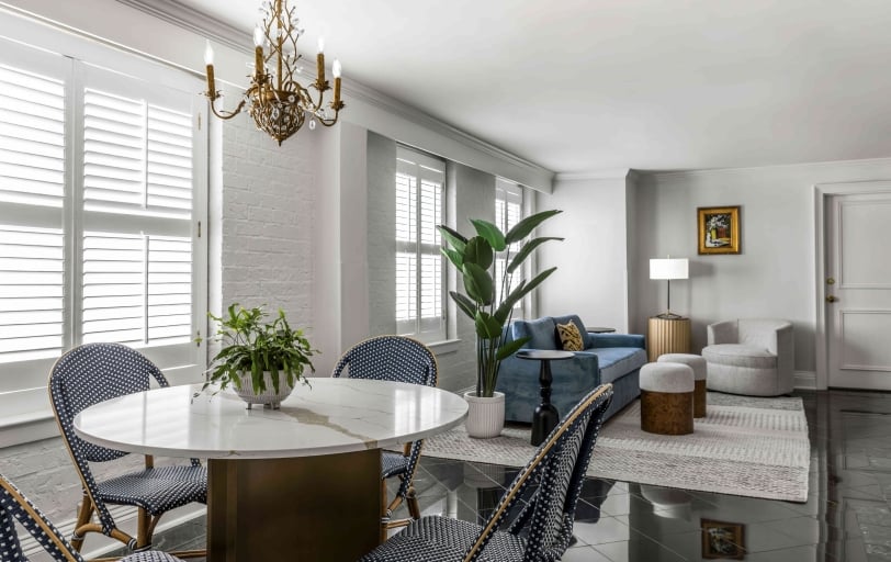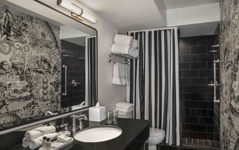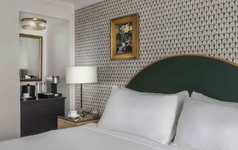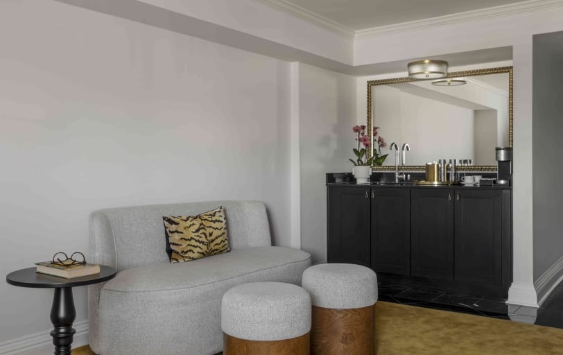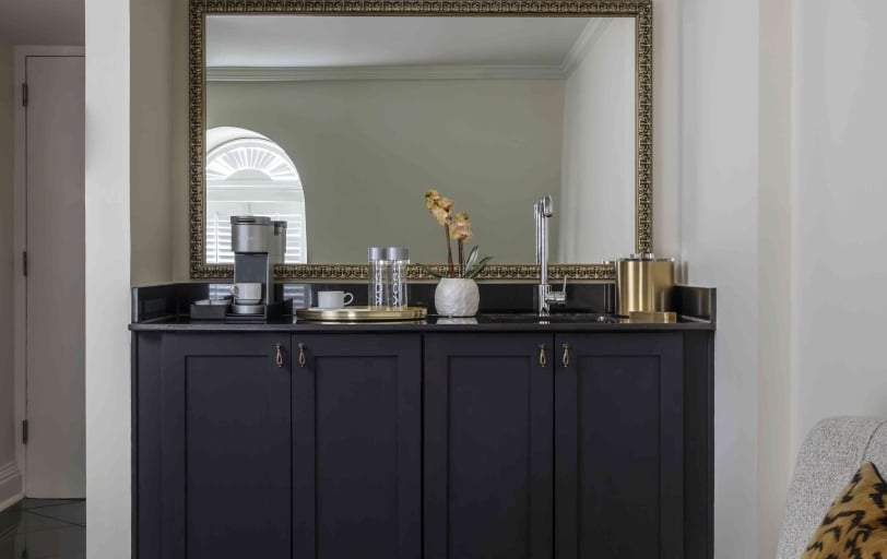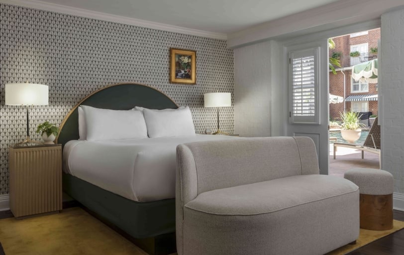 Enjoy your own sitting area styled in our modern French-country décor, a sleek kitchenette, custom wide-blade shutters, double queen beds, top floor views of the French Quarter and beautiful black marble bathrooms.