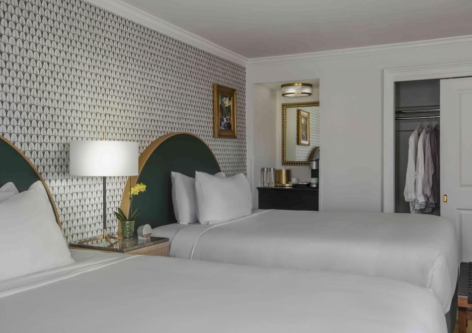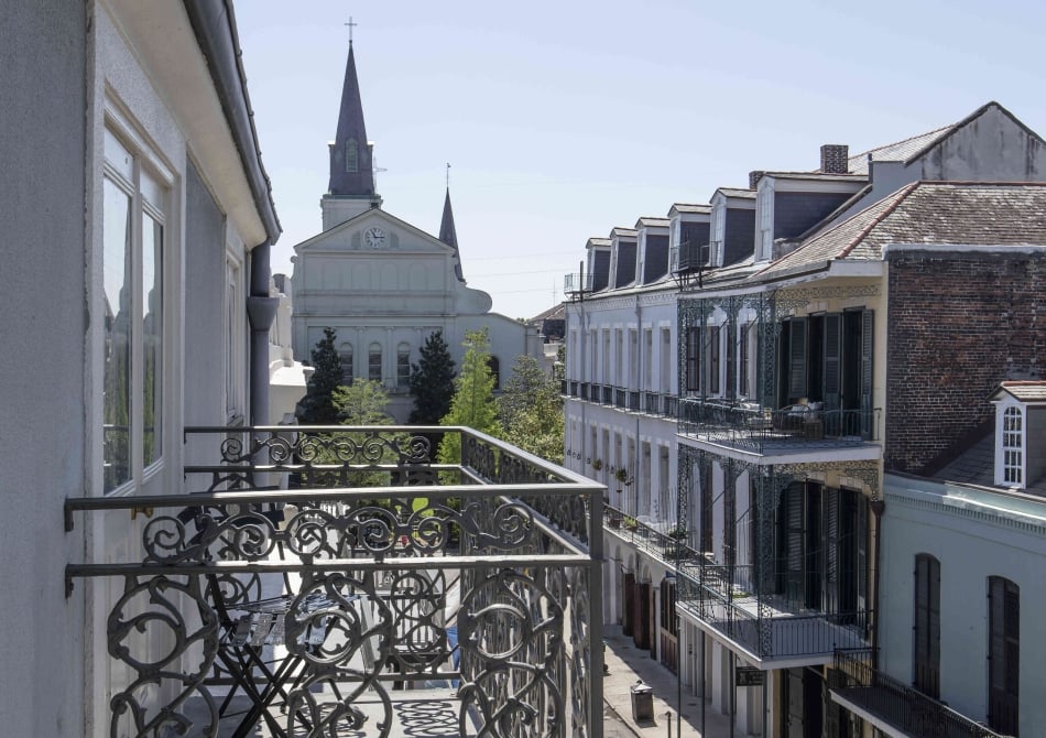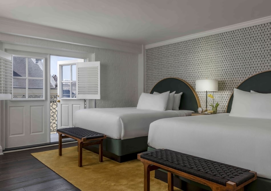 Upscale comforts in a New Orleans landmark. Equipped with double queen beds, modern French country-style décor, an ornately filigreed private balcony for two, black marble bathrooms, and unforgettable French Quarter views. Rooms feature custom wide-blade shutters, polished black marble bathrooms, hair dryer, iron and ironing board, in-room safe, coffee/tea maker, 42″ flat-screen TV, high speed internet, walk-in shower, complimentary local calls and views of the French Quarter.