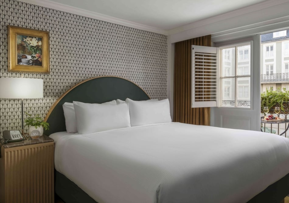 These petite guest rooms package New Orleans in a little gift with a bit of leg room, boasting modern French country-style décor, custom wide-blade shutters, courtyard balconies with views of our pool and black marble bathrooms. Room features one queen sized bed, hair dryer, iron & ironing board, in-room safe, coffee/tea maker, 42″ flat-screen TV, high speed internet, walk-in shower and complimentary local calls.