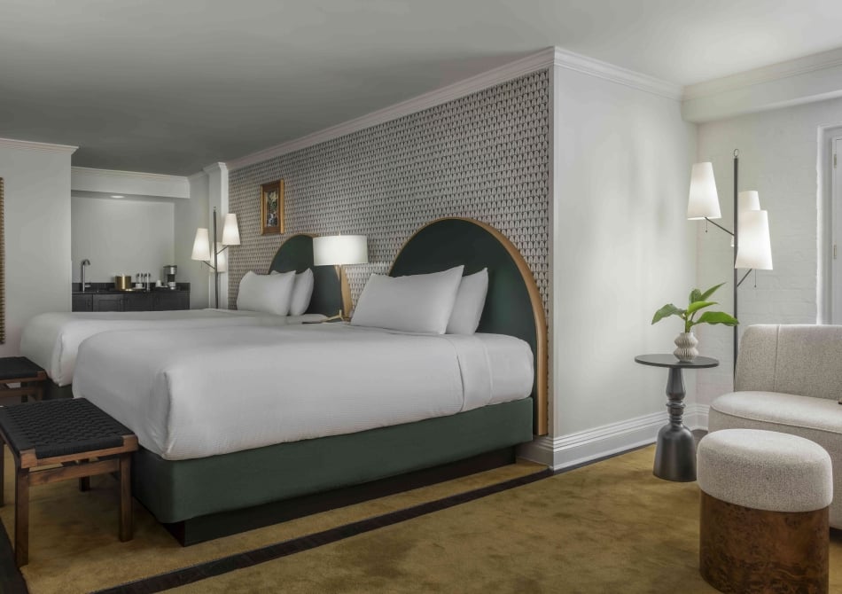 A spacious New Orleans retreat in the heart of the French Quarter. Equipped with double queen beds, its own sitting area, modern French country-style décor, black marble bathrooms and a bit of extra leg room. Rooms feature custom wide-blade shutters, polished marble bathrooms, hair dryer, iron and ironing board, in-room safe, coffee/tea maker, 42″ flat-screen TV, high speed internet, walk-in shower, and complimentary local calls. Views of the French Quarter or our courtyard.