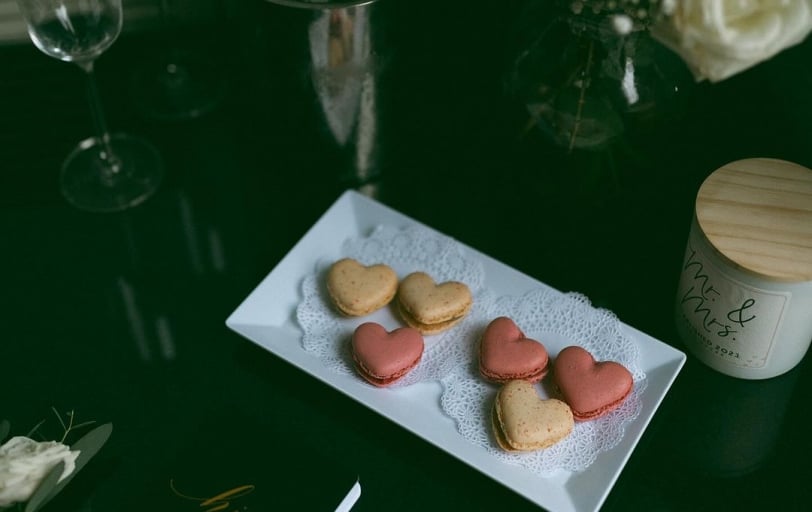 Romance your partner with sparkling wine and heart-shaped macarons for the night.